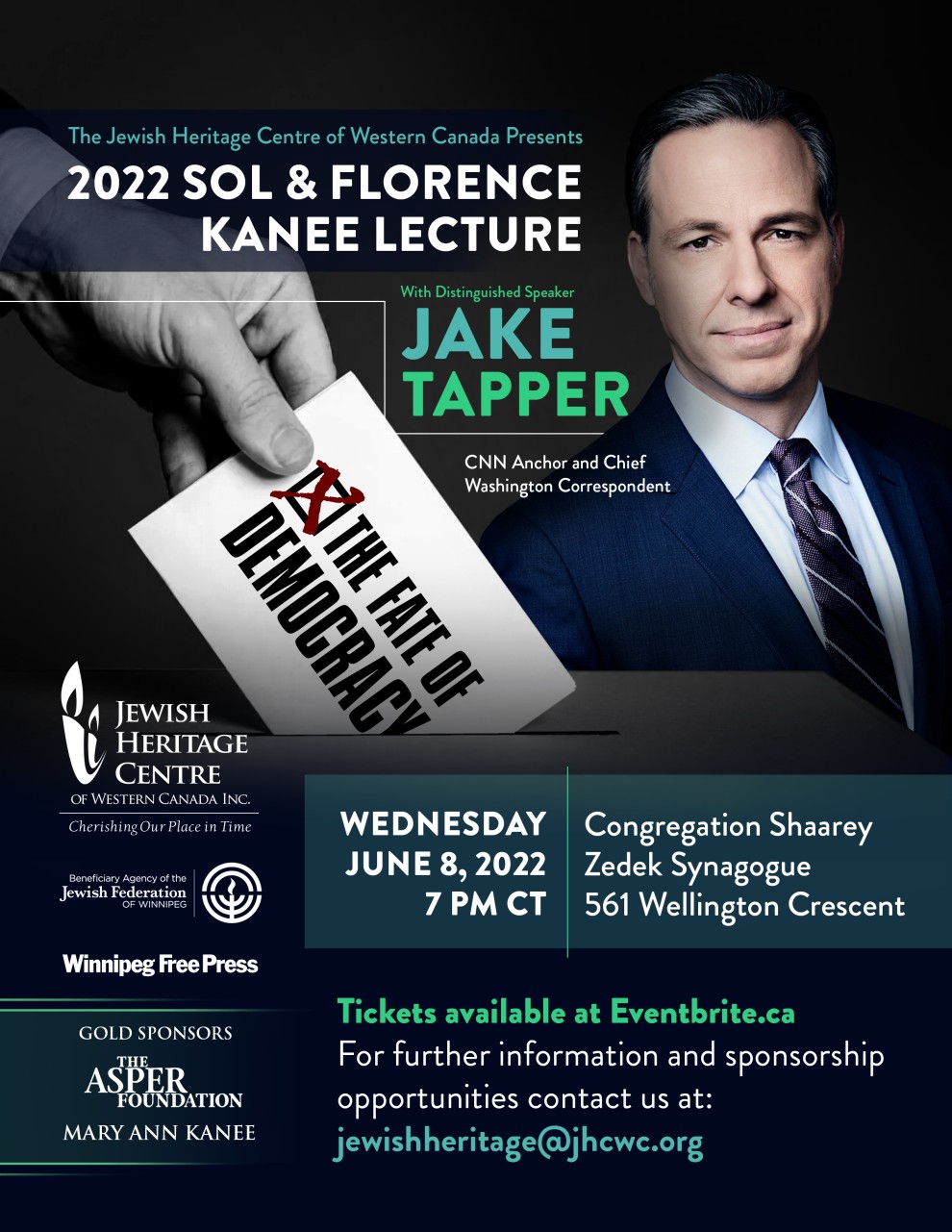 The Jewish Heritage Centre has planned the 2022 Sol and Florence Kanee Distinguished Lecture as an in-person event at Congregation Shaarey Zedek Synagogue. However, the unfolding and volatile situation in Ukraine may prevent Jake Tapper from traveling to Winnipeg due to breaking news. Should this be the case, the event would still take place in-person for guests, with Mr. Tapper appearing live onscreen from Washington, DC to take questions from the audience.