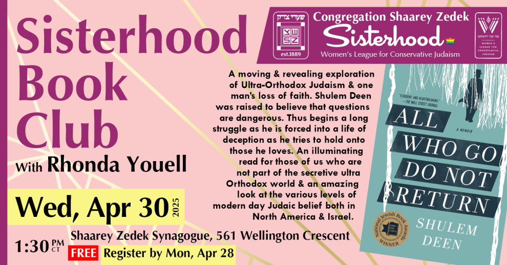 Join us for the Sisterhood Book Club meeting at Shaarey Zedek Synagogue!