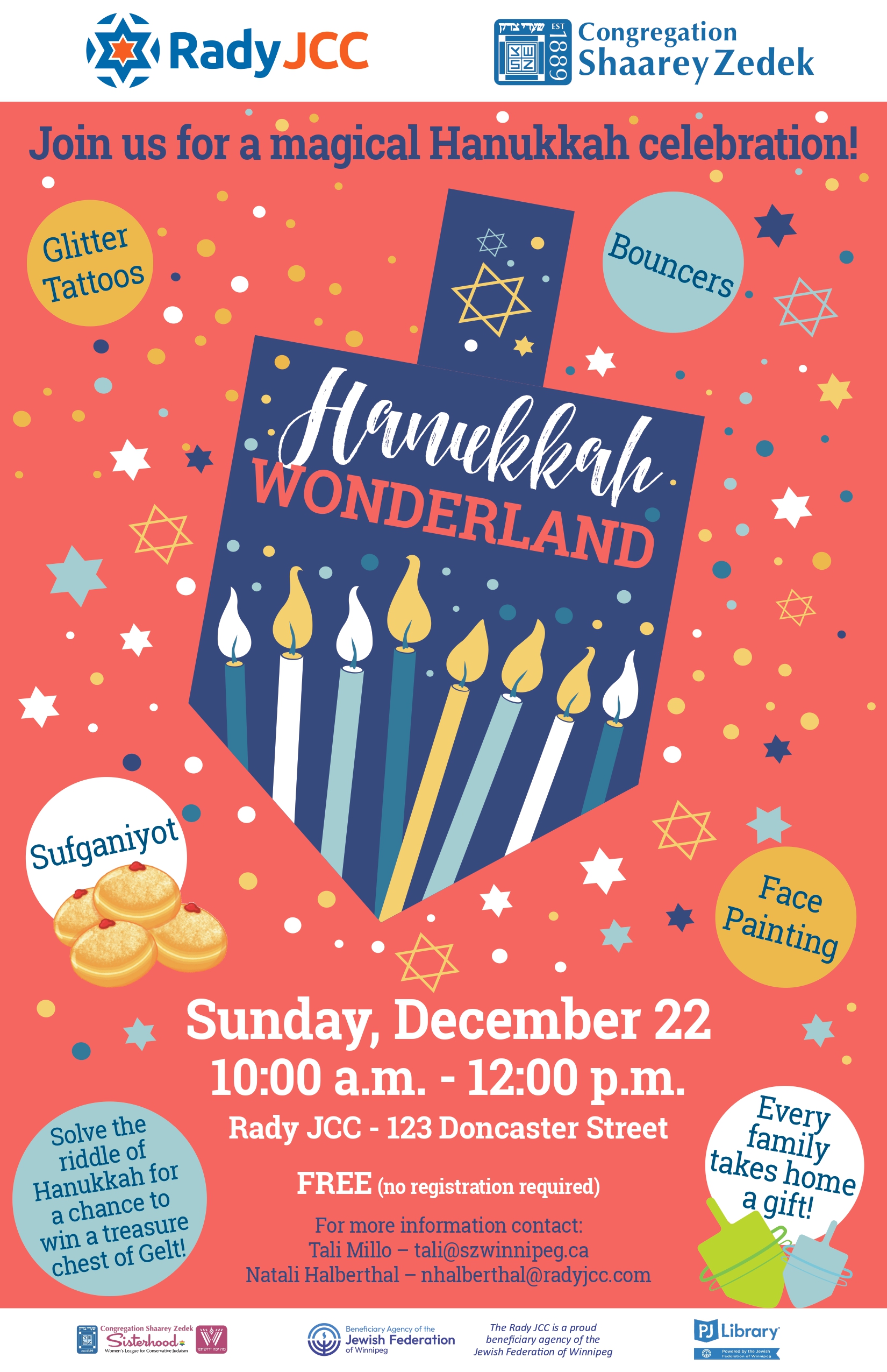 The Rady JCC and Congregation Shaarey Zedek invite you to join us for a magical Hanukkah celebration! Enjoy bouncers, face painting, glitter tattoos, a toddler area, Hanukkah games, and sufganiyot .