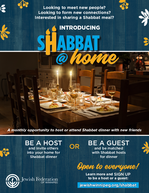 Shabbat is an opportunity for Jews to gather and relax around a lovely Friday night meal. Shabbat@Home invites you to celebrate Shabbat with old friends and new and experience the beauty of Shabbat in a comfortable environment.