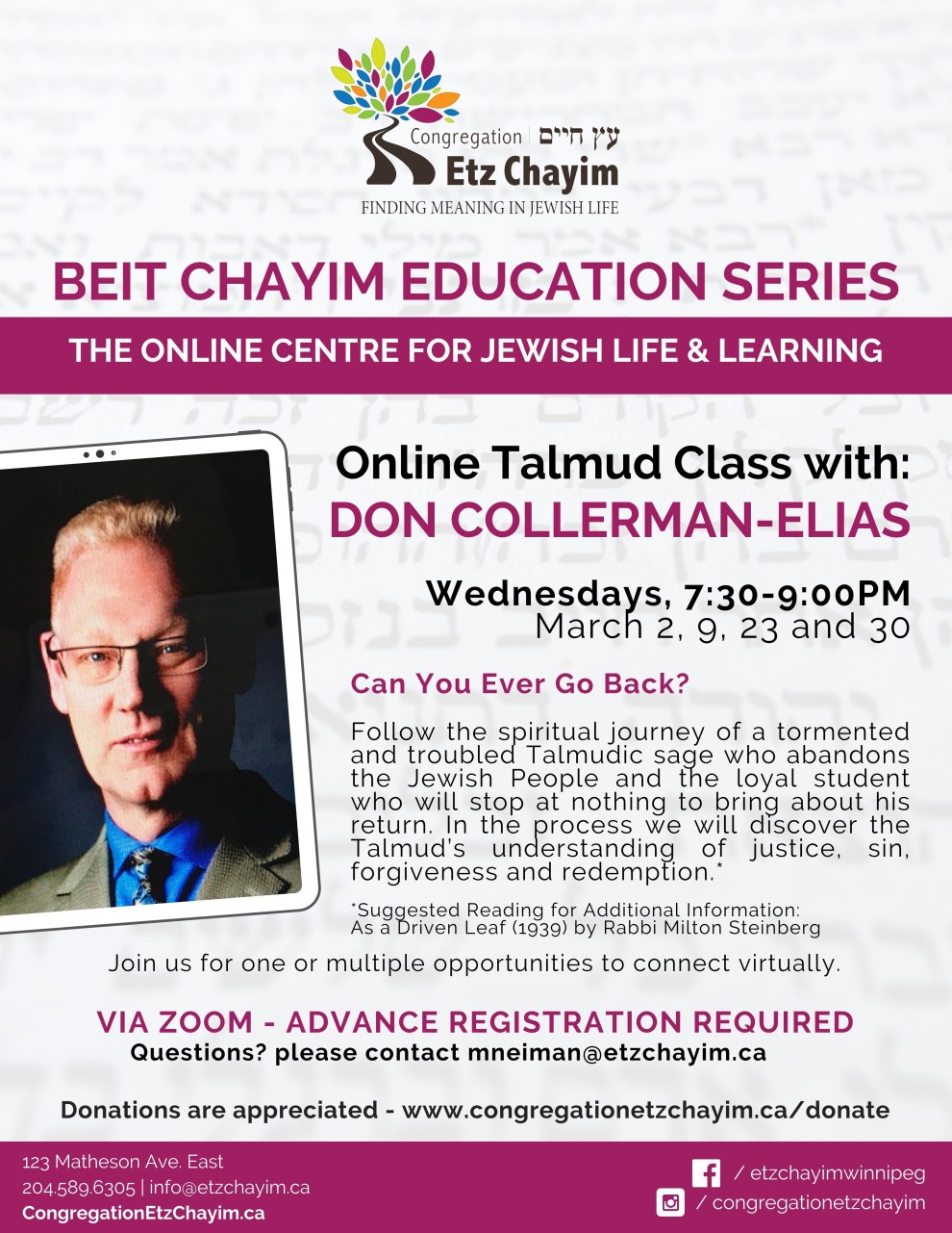 This talmud study will be facilitated by Don Collerman Elias