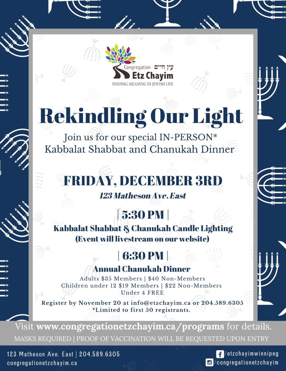 It’s been a while since we have been able to be together. Join Congregation Etz Chayim as we slowly begin to rekindle our light and our community in person with a special Kabbalat Shabbat, Chanukah Candle Lighting, and the RETURN of our Chanukah dinner including latkes!