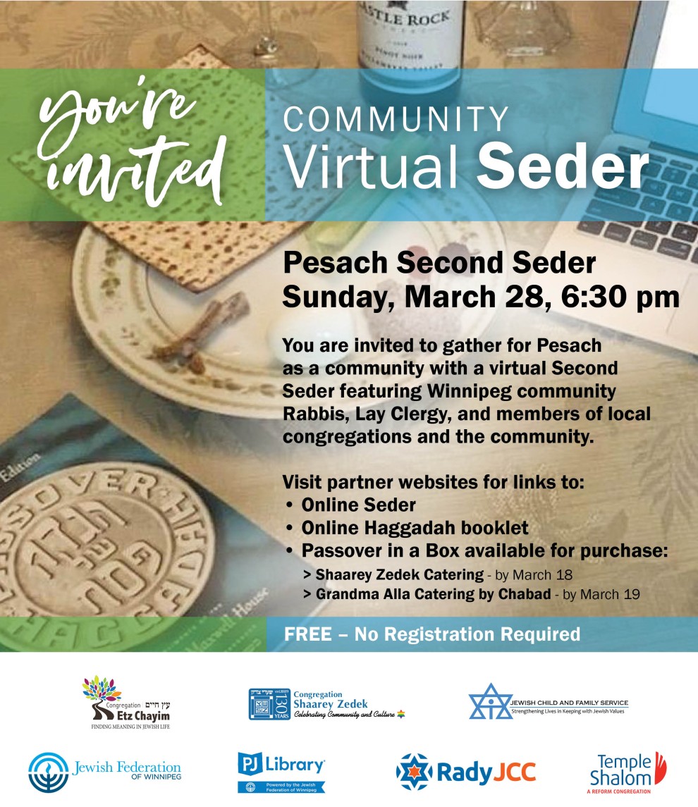 You're invited to a virtual community seder on the second night of Pesach on Sunday, March 28th at 6:30 pm. This special evening will feature Winnipeg community Rabbis, Lay Clergy, and members of local congregations and the community coming together to celebrate the emancipation of our Jewish ancestors from slavery in ancient Egypt.