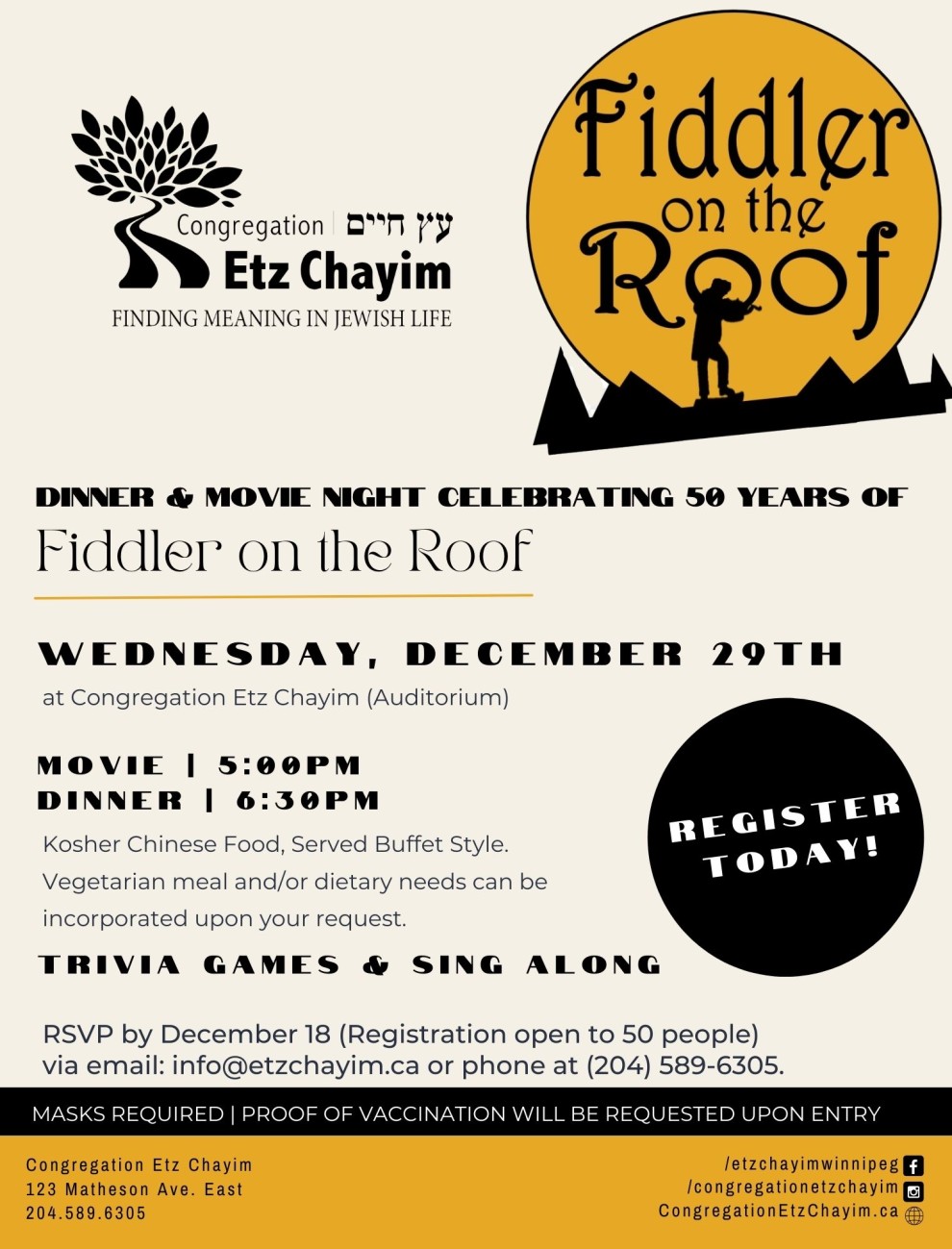 This year marks the 50th Anniversary of Fiddler on the Roof which debuted on the screen in 1971. To mark this special simcha, we invite you to join our community for a special viewing of the film, Kosher Chinese Food, a likely sing-a-long, and movie trivia.