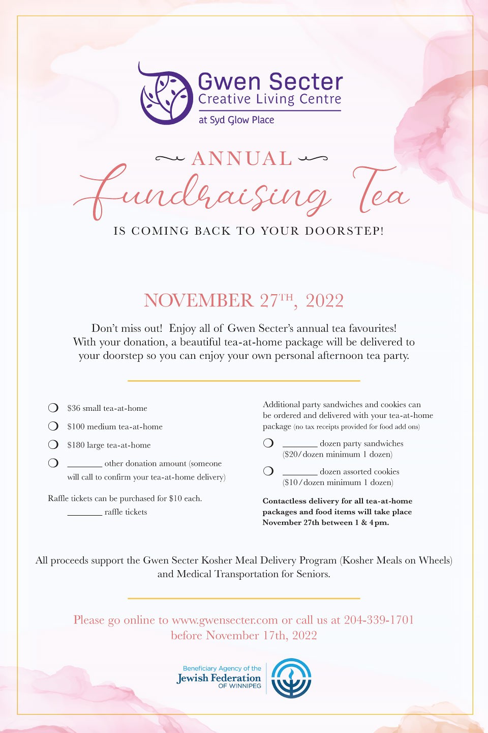 Gwen Secter's annual fundraising tea is coming back to your doorstep again this year. Place your orders by November 17th, 2022. Who's ready for party sandwiches?