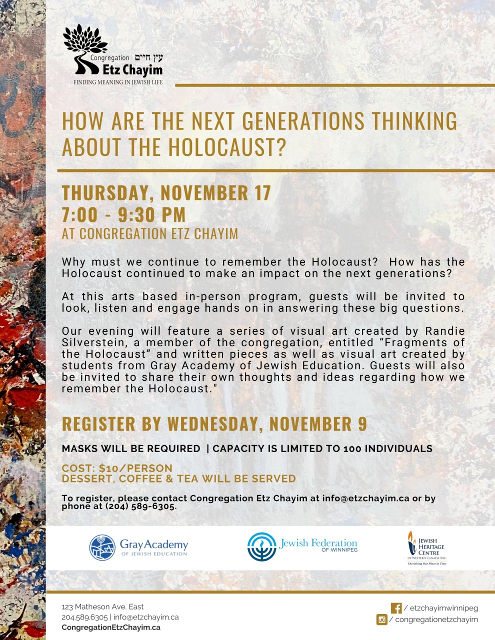 Why must we continue to remember the Holocaust? How has the Holocaust continued to make an impact on the next generations? At this arts based program at Congregation Etz Chayim, guests will be invited to look, listen and engage hands on in answering these questions.