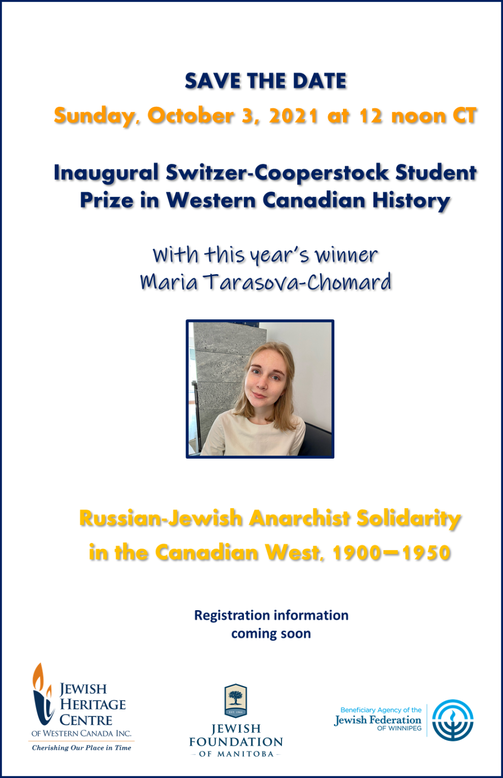 The Jewish Heritage Centre of Western Canada is pleased to present Maria Tarasova as the first winner of the Switzer-Cooperstock Student Prize in Western Canadian Jewish History. Maria will be joining us virtually from Paris, France. This prize, established by the Switzer family to honour their parents and grandparents is awarded for the best student essay on Jewish history in Western Canada with some preference for essays on secular Jewish schools in Western Canada, Jewish settlers, farmers, and traders in rural areas of Western Canada, and the immigration experience of Jews to Western Canada. Preference is given to research specific to the Jewish experience in the urban centers and rural communities of the Canadian Prairie Provinces.
