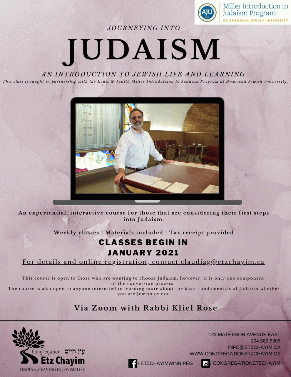 Please contact Claudia Griner for more details at claudiag@etzchayim.ca