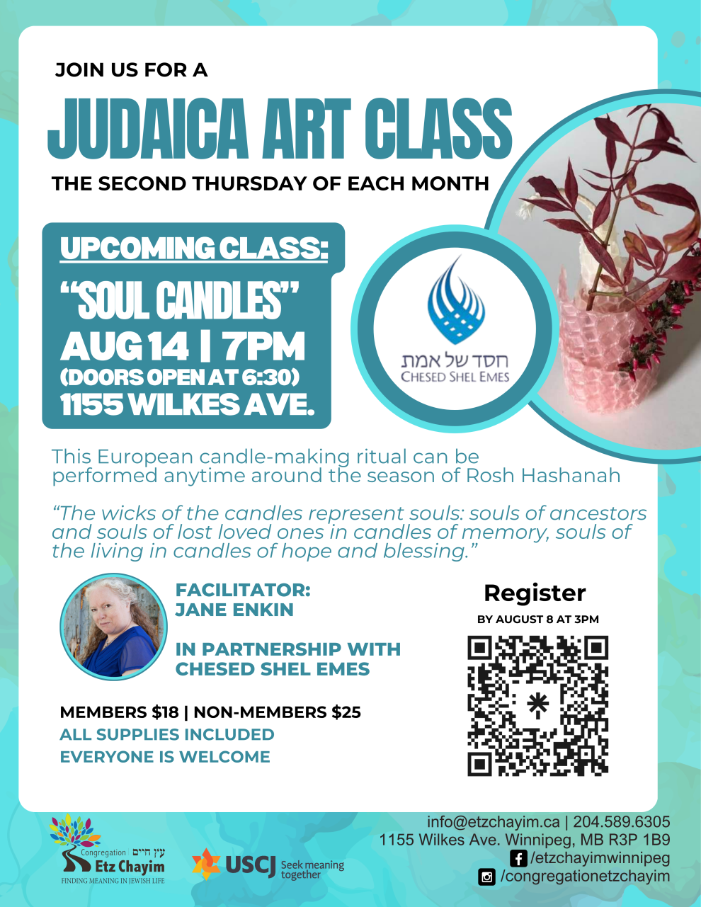 This month’s class, “Soul Candles,” explores a meaningful European candle-making tradition in honor of Rosh Hashanah. Led by facilitator Jane Enkin in partnership with Chesed Shel Emes, participants will create candles that symbolize memory, hope, and blessing.