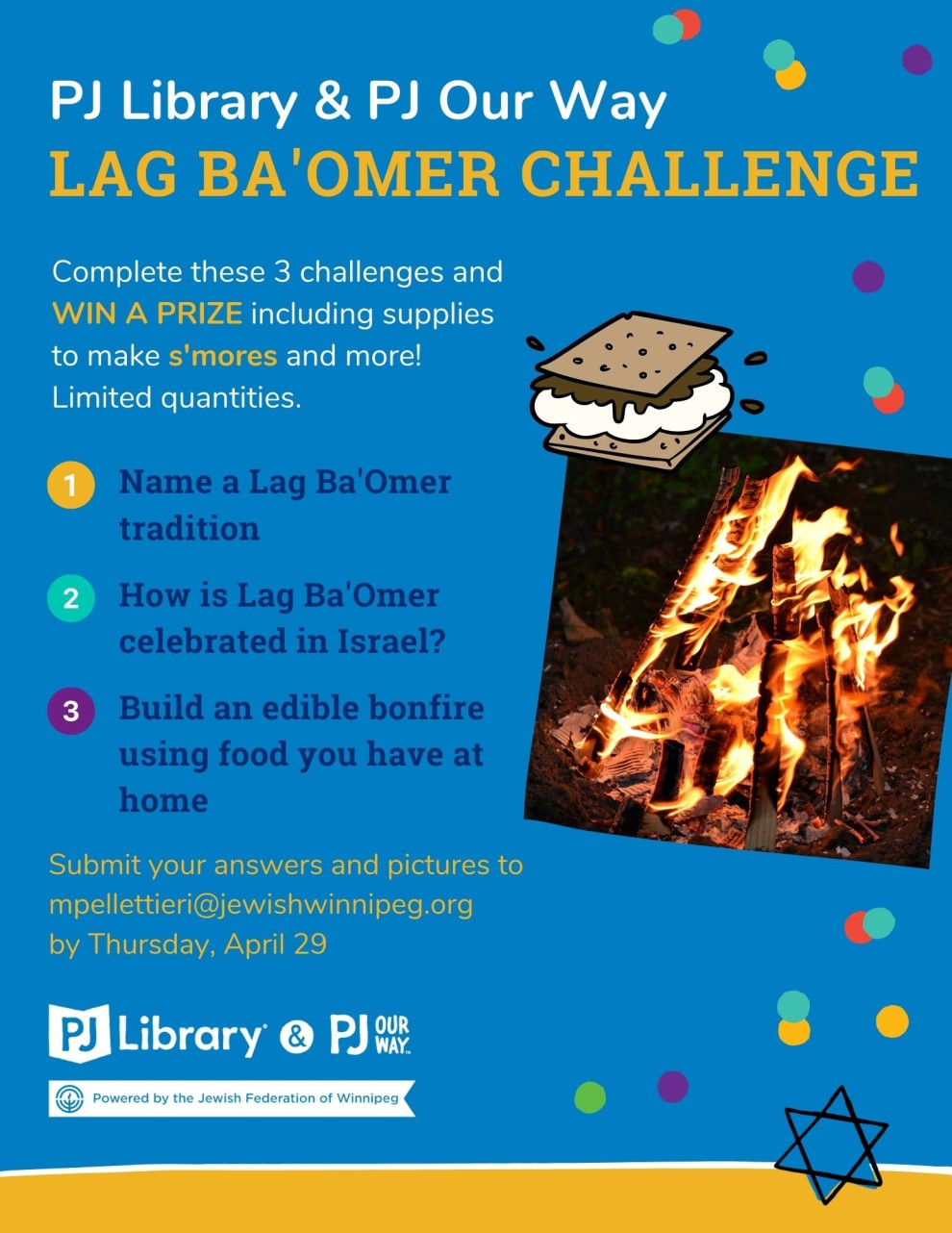 Complete these 3 challenges and win a prize including supplies to make s'mores and more! Limited quantities. Submit your answers and pictures to mpellettieri@jewishwinnipeg.org by Thursday, April 29.