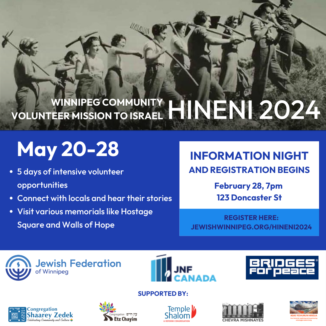 For the first time Federation, JNF and Bridges for Peace are partnering together as a unified front. Sign up and join us on February 28, 7pm to find out about participating in our Winnipeg Community Volunteer Mission to Israel; Hineni 2024.