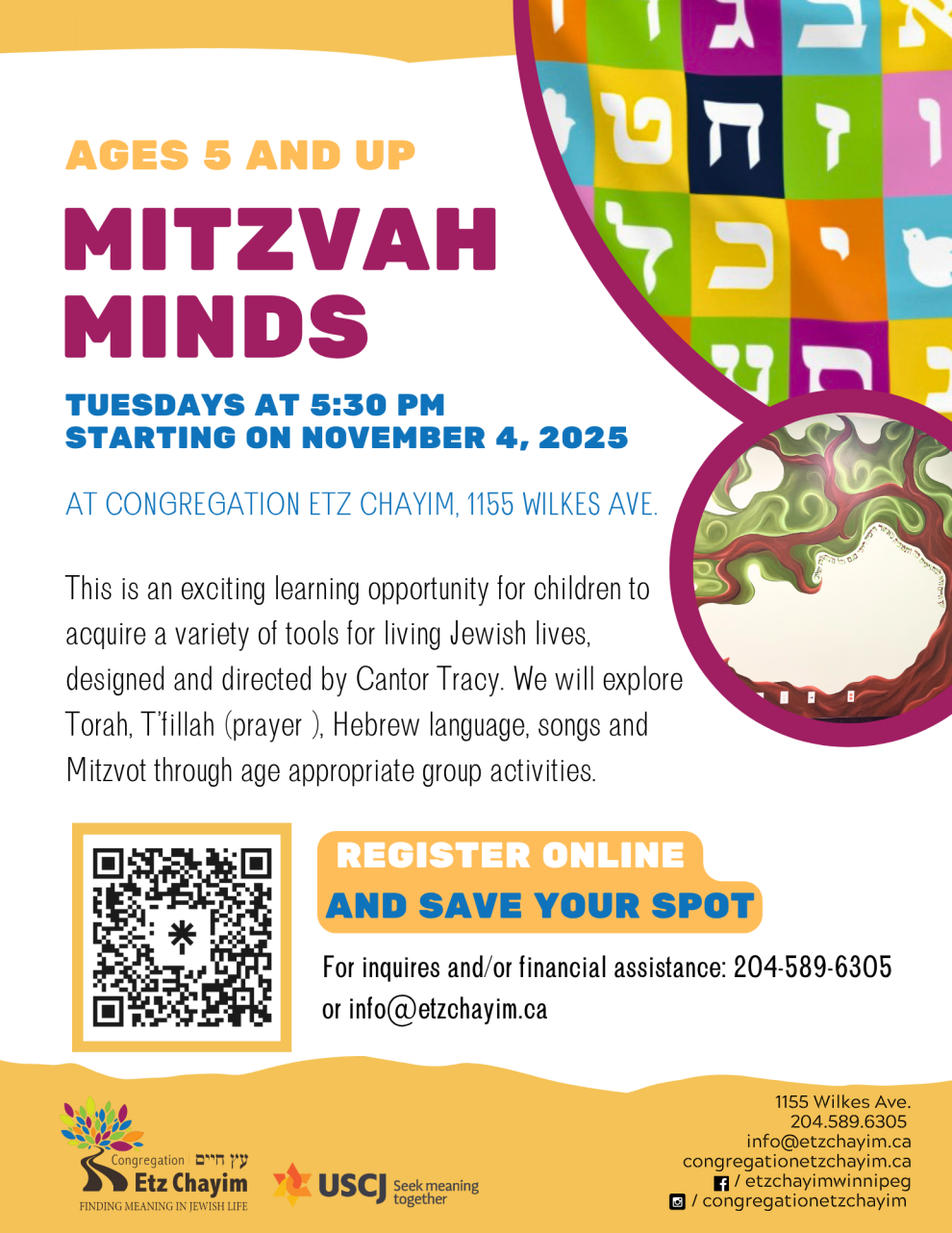 Mitzvah Minds is perfect for families who want to introduce their children (Kindergarten & up) to the beauty of Judaism through mitzvot, songs, stories, and games.Join us Tuesdays from 5:30–6:30 PM starting November 4 for a joyful and engaging Jewish learning experience!
