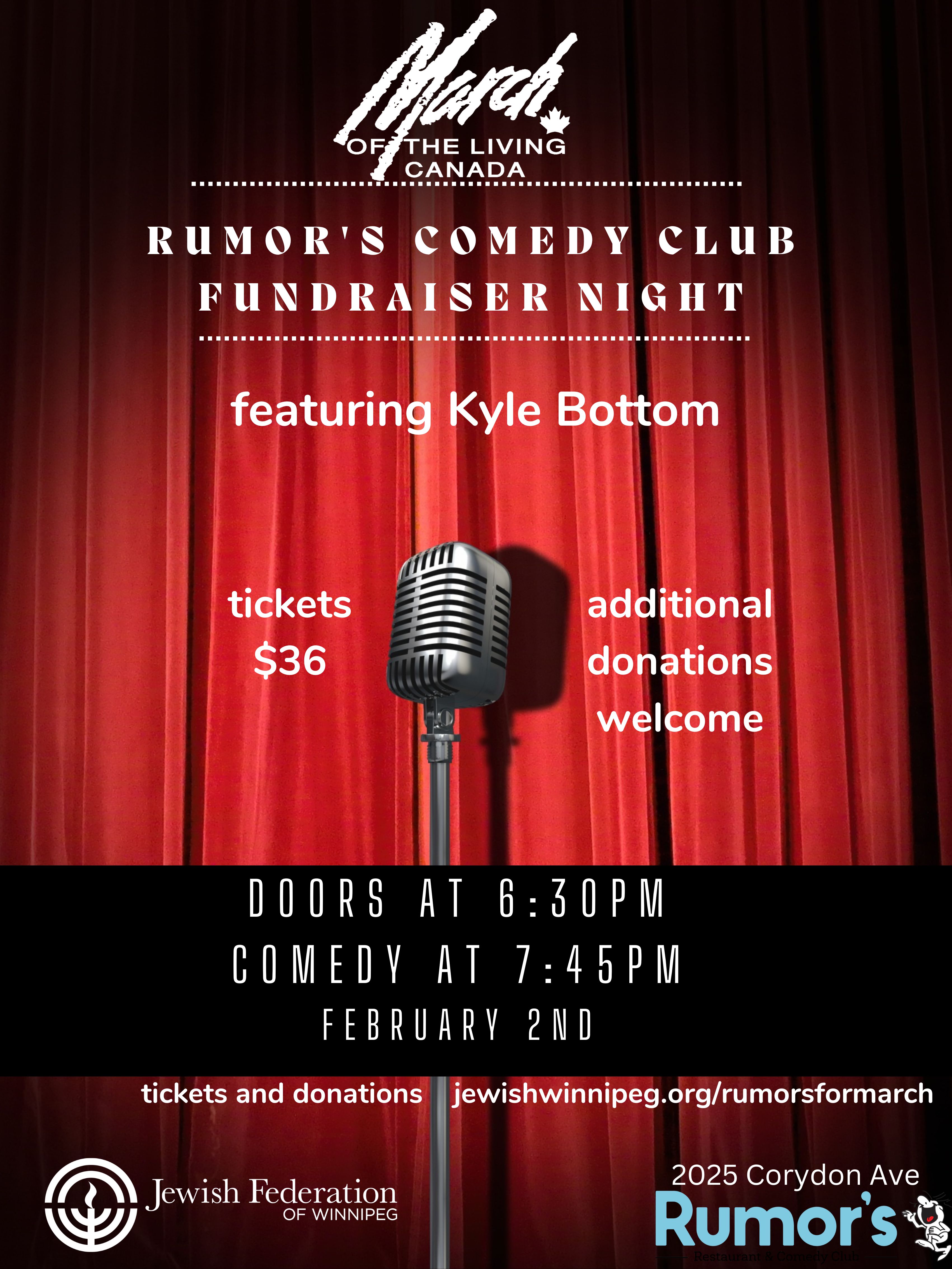 Join in for a night of comedy at Rumors! Questions? Contact Abby aflackman@jewishwinnipeg.org