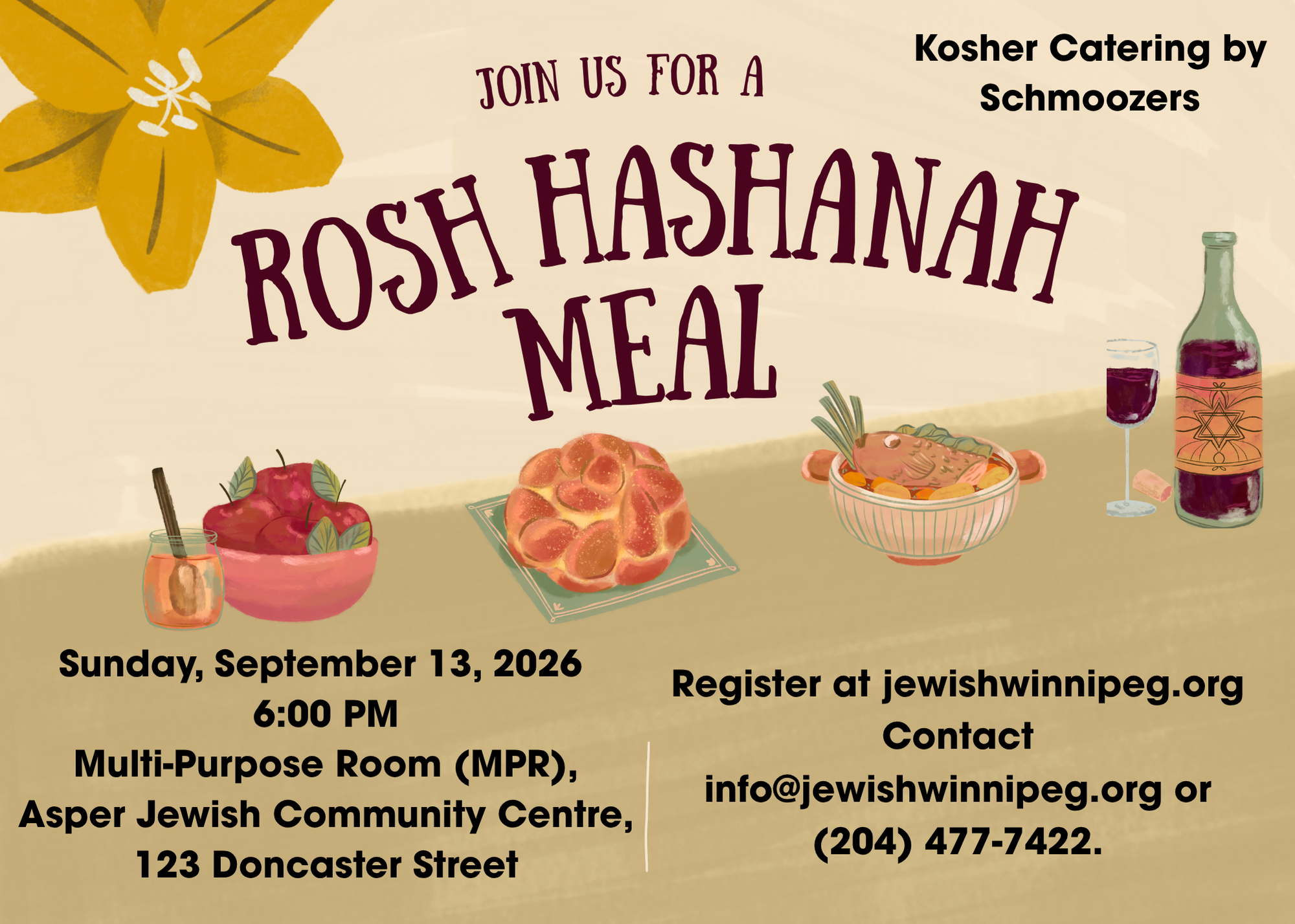 On September 13, 2026 at 6 PM, please join the Jewish Federation of Winnipeg for dinner as we celebrate Rosh Hashanah.