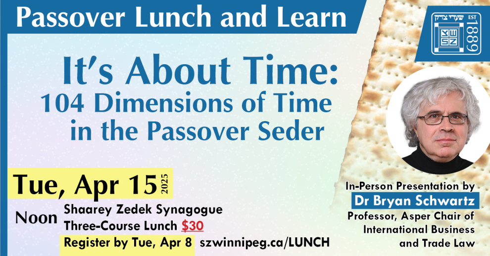 Bryan will be discussing some ideas from his book It's About Time: 104 Dimensions of Time in the Passover Seder. In a series of what used to be called “quick snappers”, Schwartz points out, for example, that Passover (Pesach) actually combines two ancient Jewish spring festivals – the sacrifice of the first-born lamb and the first fruits of the harvest of the grain that was planted in the late fall or winter. He groups his explanations and commentaries into 21 categories related to time. The first group – Cyclical Time – discusses Pesach’s connection to Purim preceding it and Shavuot seven weeks later. He further explains Pesach in Israel and why, in Israel, only one Seder is designated as compared to two in the diaspora, how the date for the first Seder is officially determined, and what the rules are when the Seders overlap with Shabbat. Registrants can download the book for free by www.sacredgoof.ca/wp-content/uploads/2024/04/The-Passover-Seder-Its-About-Time.pdf