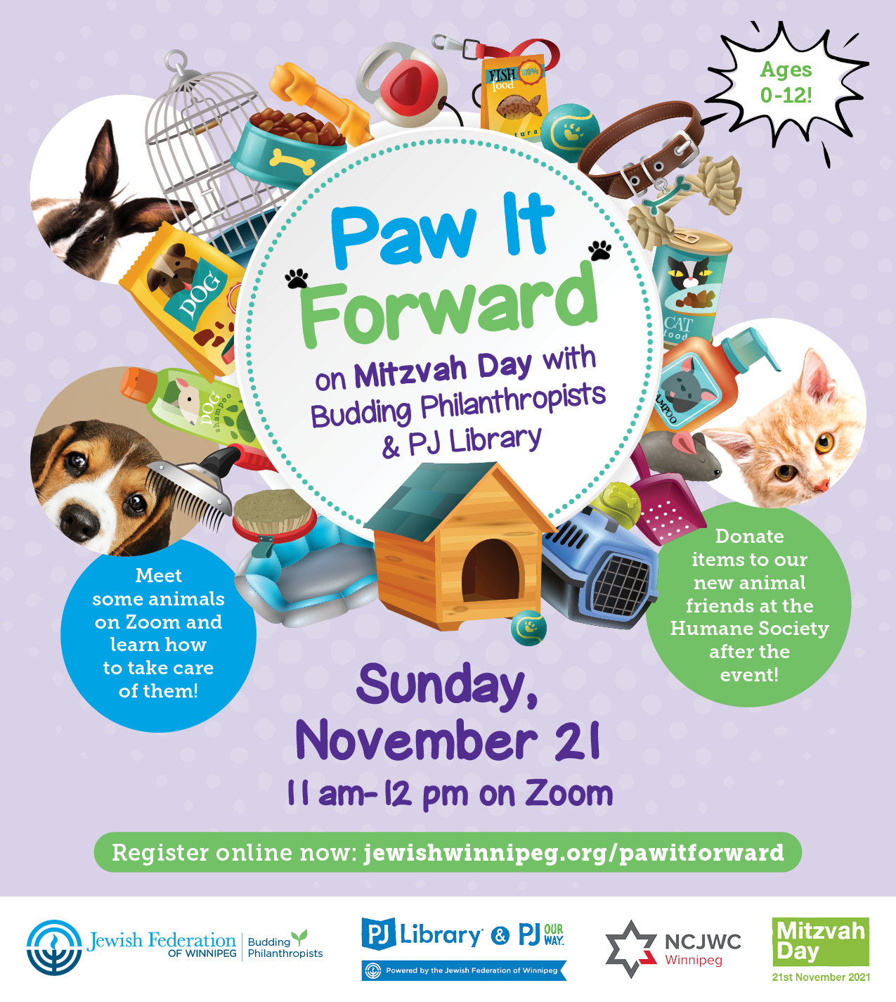 On November 21st, at 11 am, Budding Philanthropists and PJ Library are hosting a virtual event with some furry friends from the Winnipeg Humane Society for International Mitzvah Day! Kids will get to meet the animals and learn a bit about how to take care of them. After the event we will be collecting items to donate to the animals at the Humane Society. We hope you can join us!