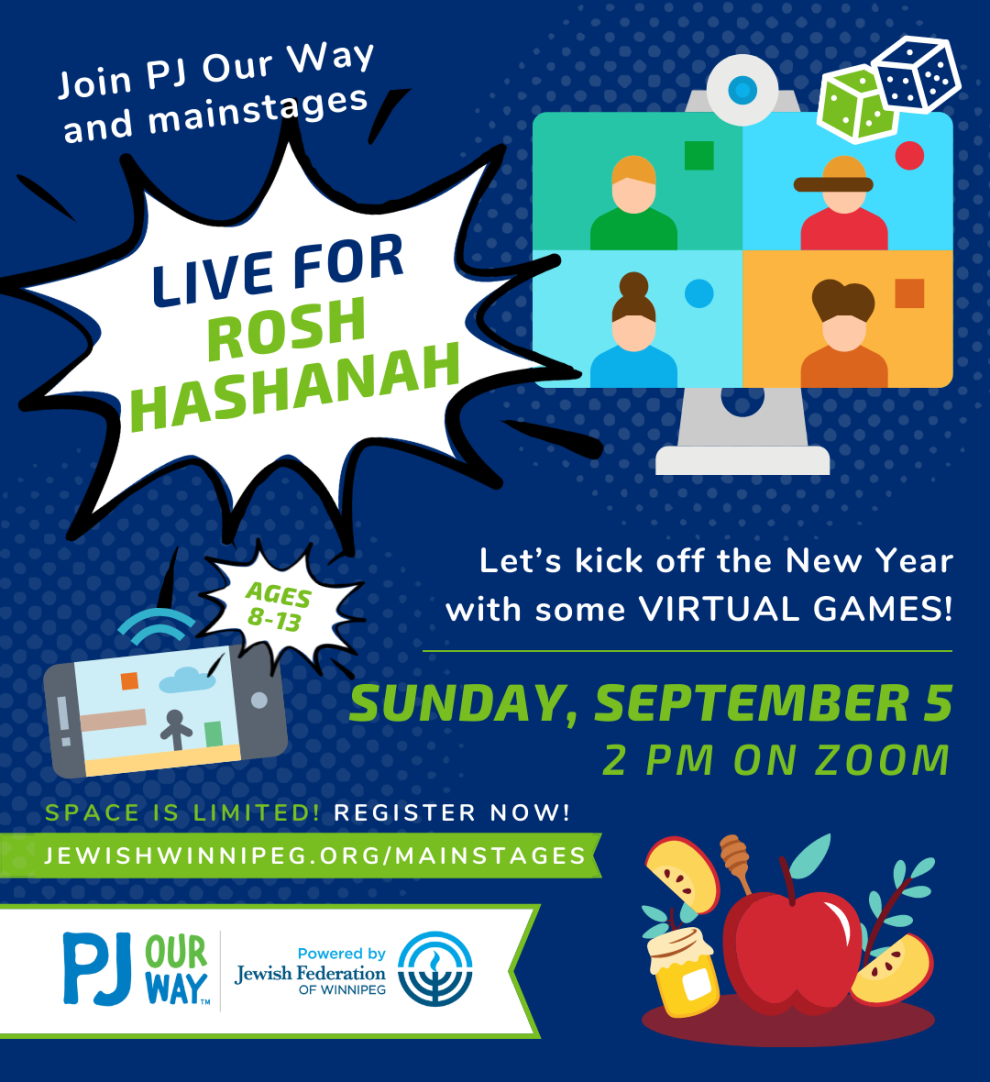 Join PJ Our Way & Main Stages LIVE for Rosh Hashanah! Let’s kick off the New Year with some virtual games! Spaces Limited! Register at www.jewishwinnipeg.org/mainstages Ages 8-13