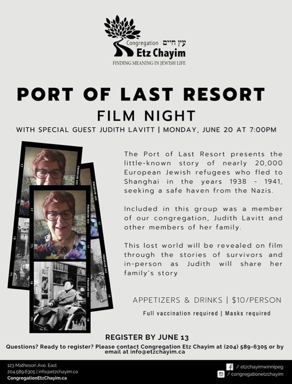 The Port of Last Resort presents the little-known story of nearly 20,000 European Jewish refugees who fled to Shanghai in the years 1938 - 1941, seeking a safe haven from the Nazis. Included in this group was a member of Congregation Etz Chayim, Judith Lavitt and other members of her family. This lost world will be revealed on film through the stories of survivors and in-person as Judith will share her family’s story.