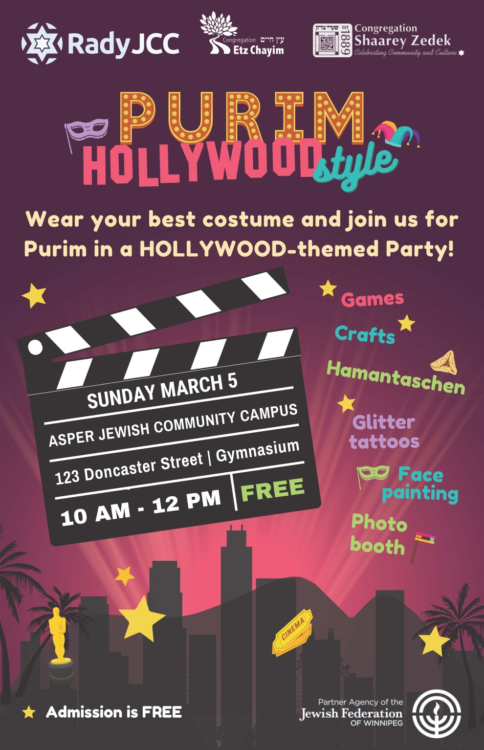 Wear your best costume and join us for Purim in a HOLLYWOOD themed party!