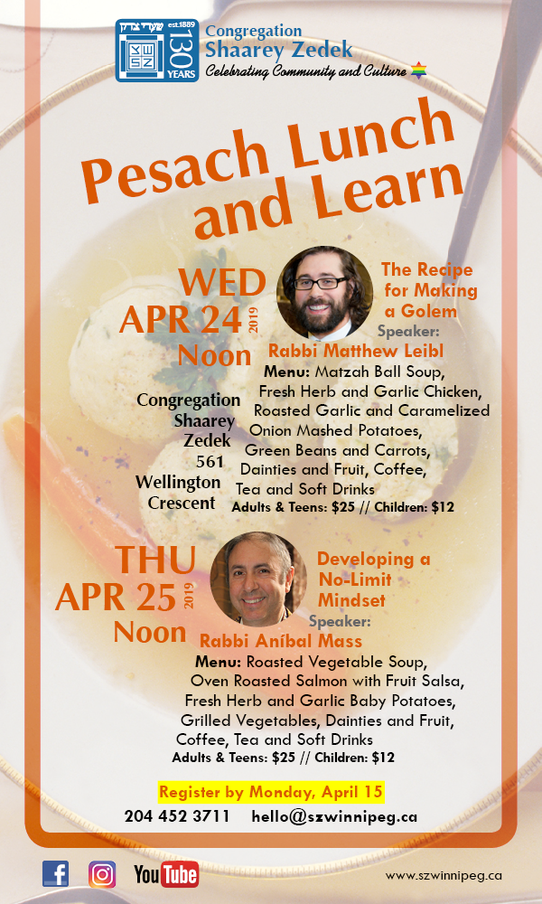 A Pesach Lunch and Learn with Rabbi Matthew Leibl will be held on Wednesday, April 24