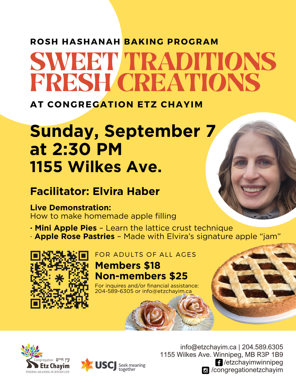 Join us at Congregation Etz Chayim for a delicious hands-on baking experience! On Sunday, September 7 at 2:30 PM, Elvira Haber will guide participants through a live demonstration on making homemade apple filling, then teach us how to create Mini Apple Pies and stunning Apple Rose Pastries using her signature apple “jam.”