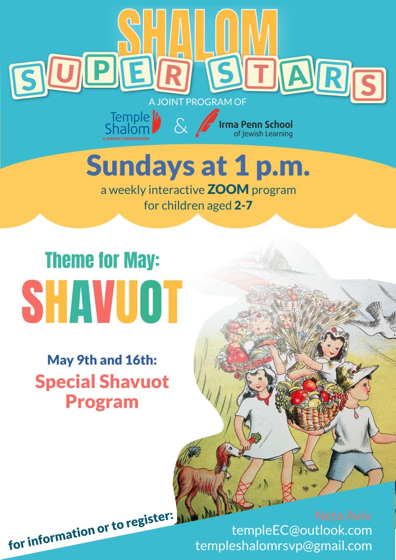 For children aged 2-7. Participants will explore Nature & Tu B'Shvat in English & Hebrew. Programs are "Storytelling" (Jan 17), "Bingo" (Jan 24) & a Community Wide Tu B'Shvat program (Jan 31) & for February "Storytime Purim Story" (Feb 7), "Purim Craft - Make your own Mask" (Feb14), "Purim Puppetry Shoshan Style (Feb 21)" & "Purim Bingo (Feb 28)"