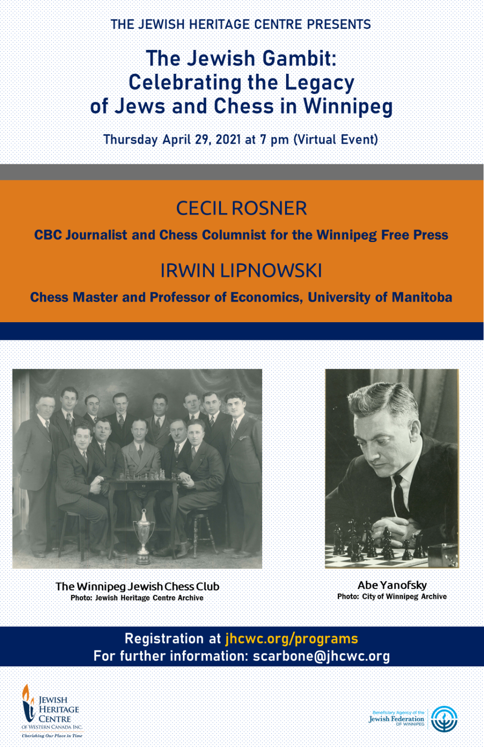 Have you binge-watched "The Queen's Gambit"? Come hear Winnipeg chess mavens Cecil Rosner and Irwin Lipnowski trace the legacy of Jews and chess in Winnipeg.