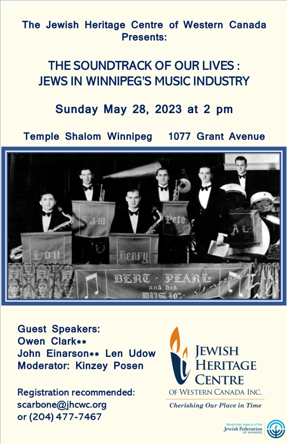 The Jewish Heritage Centre presents a program on how Jews contributed to Winnipeg's music industry. Moderated by Kinzey Posen, speakers will be Owen Clarke, John Einarson and Len Udow.