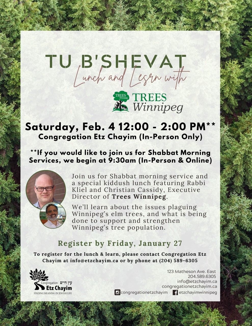 Following our Shabbat morning service, we invite you to a special kiddush lunch & learn for Tu B’Shevat featuring Rabbi Kliel and Christian Cassidy, Executive Director of Trees Winnipeg. We’ll engage in a holiday themed text study and learn about the issues plaguing Winnipeg’s elm trees, what the organization Trees Winnipeg is doing to support and strengthen Winnipeg’s tree population and how we can make a difference.
