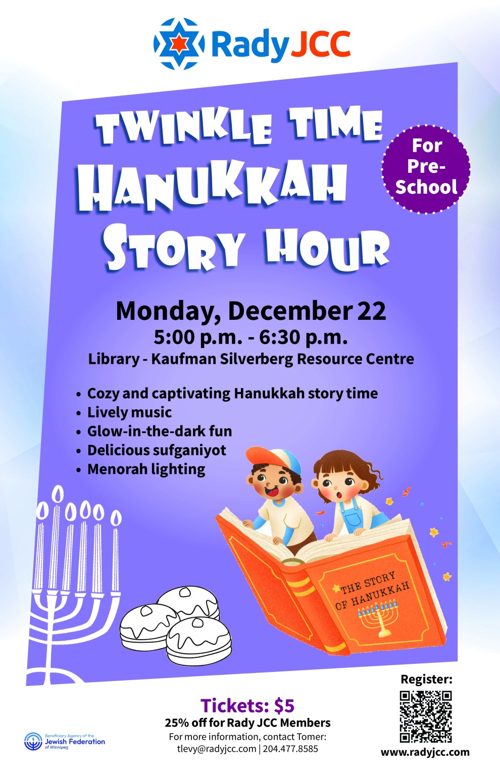 Join us for a joyful Hanukkah storytime filled with music and glow-in-the-dark fun. Together we will light the final candle, enjoy delicious sufganiyot, and celebrate the spirit of the holiday.