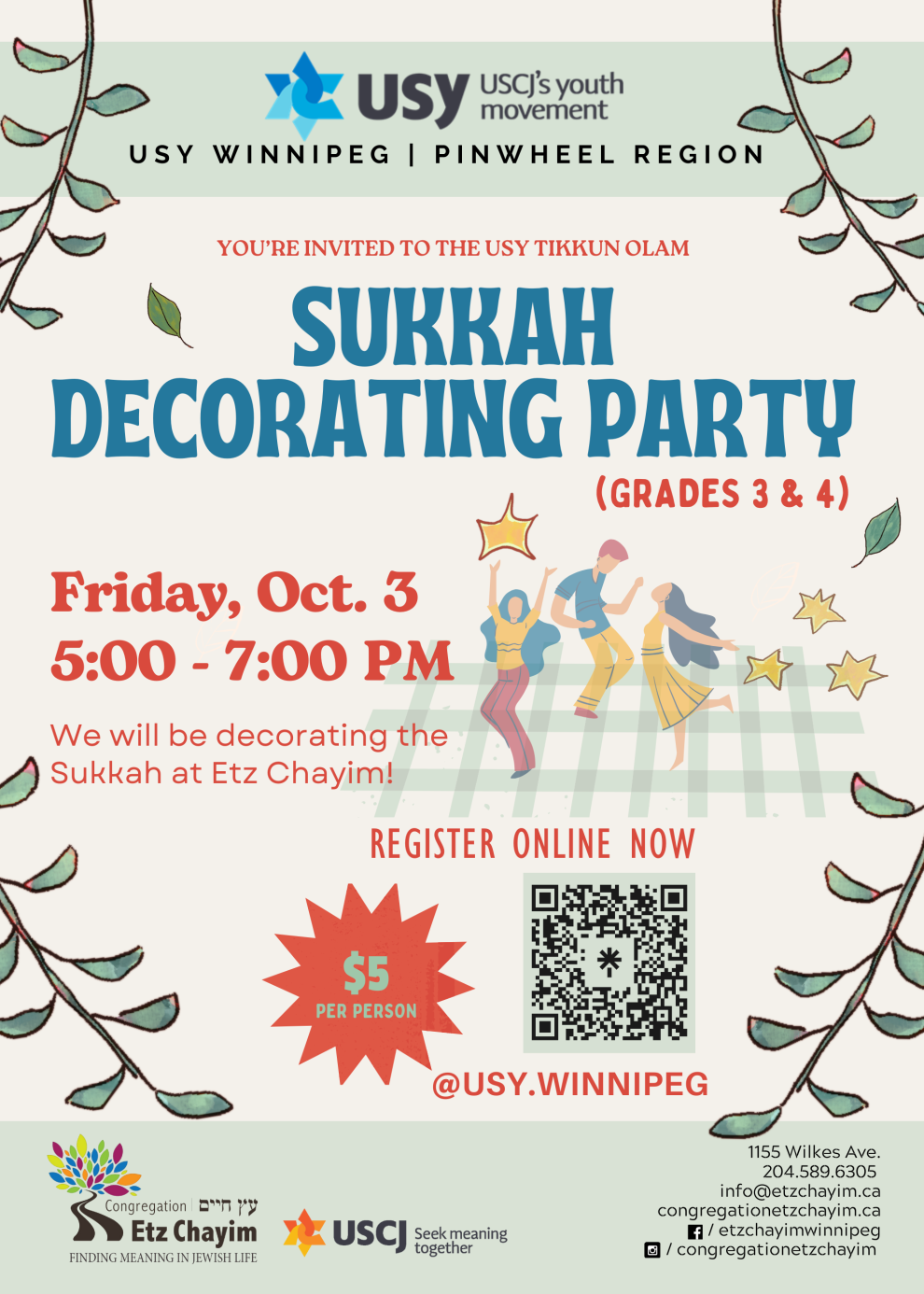 | Shanah Tovah, I am so excited to announce the USY program lineup for October! Please see below for dates and information. Friday, October 3rd (5:00 - 7:00 pm): Join us on Friday night for a Sukkah decorating party, complete with food, art, and friends! This will be our first program exclusively for Grades 3-4. We’re looking forward to getting to know you all! 📍Congregation Etz Chayim, 1155 Wilkes Avenue ⏰ 5:00 – 7:00 PM 💲$5 per child Register HERE to secure your spot! As always, please reach out to me with any questions or concerns. If you’re in Grade 9 or above and interested in earning volunteer hours or helping out in the community, please send us an email. We’d love to have your support! See you there! Warmly, Nomi Feuer USY Winnipeg Advisor usy@etzchayim.ca |