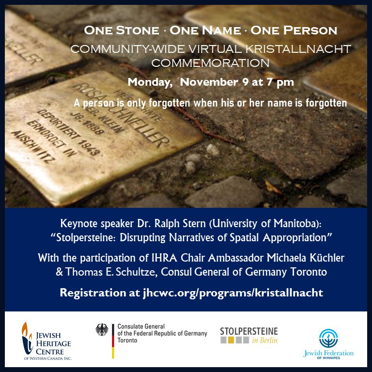 Please join us and the Jewish Heritage Centre of Western Canada from the safety of your own home on November 9 for the community-wide virtual Kristallnacht commemoration: "Stolpersteine: Disrupting Narratives of Spatial Appropriation” with keynote speaker Dr. Ralph Stern. Unfortunately, due to Code Red restrictions, the accompanying Stolpersteine exhibit in the Holocaust Education Centre has been closed.