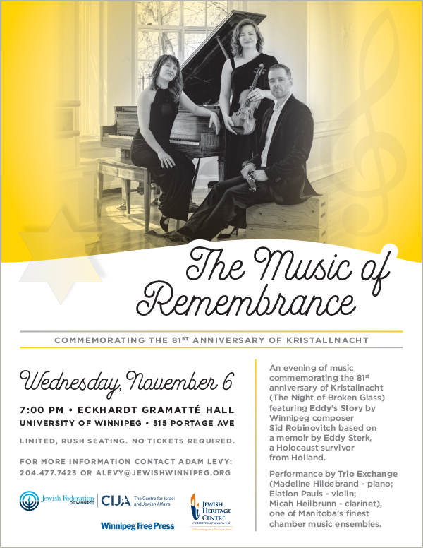 Please join us for an evening of music commemorating of the 81st anniversary of Kristallnacht (The Night of Broken Glass) featuring Eddy's Story by Winnipeg composer Sid Robinovitch based on a memoir by Eddy Sterk, a Holocaust survivor from Holland.