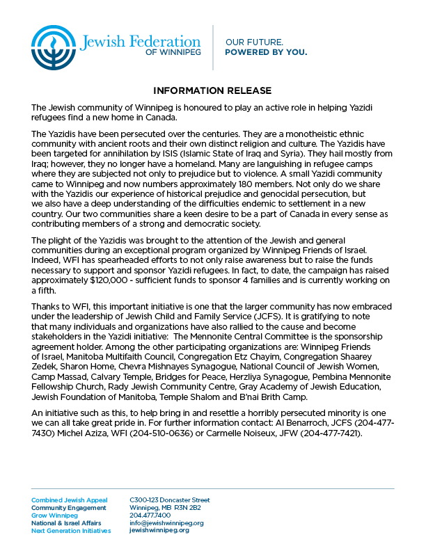 The Jewish community of Winnipeg is honoured to play an active role in helping Yazidi refugees find a new home in Canada. See Information Release below for details.