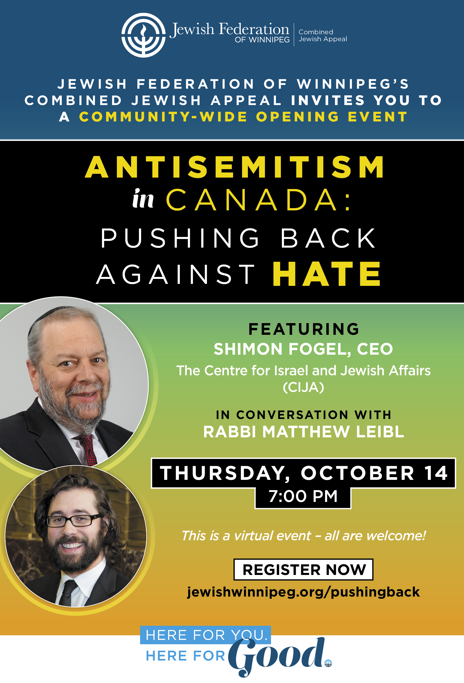 Jewish Federation of Winnipeg's Combined Jewish Appeal invites you to a community-wide opening event featuring Shimon Fogel, CEO of Centre of Israel and Jewish Affairs (CIJA) in conversation with Rabbi Matthew Leibl. Please join us on Thursday, October 14 at 7:00pm on Zoom.