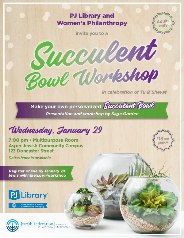 Join PJ Library and Women's Philanthropy for a Succulent Bowl Workshop! Make your own personalized succulent bowl! Presentation and workshop by Sage Garden. Adults only and limited space so register online now!