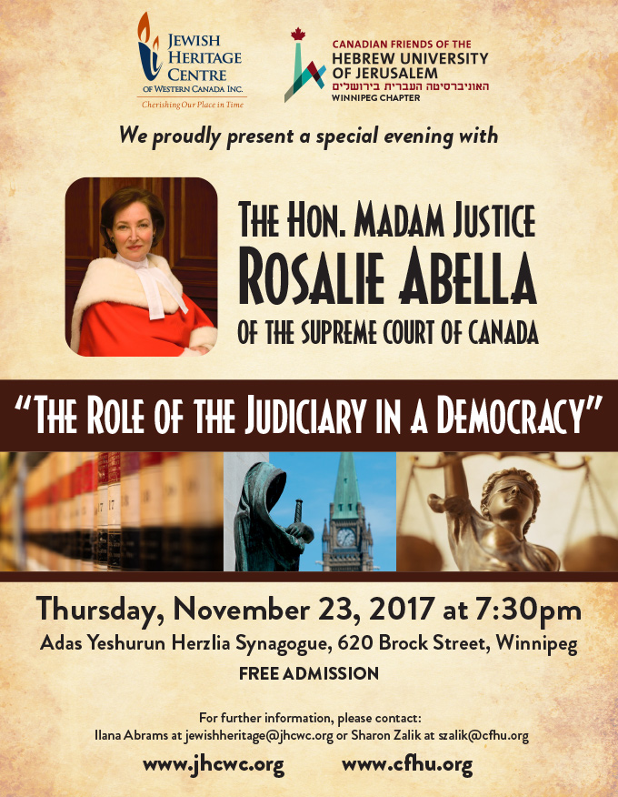 The Jewish Heritage Centre of Western Canada has partnered with Hebrew University in sponsoring a program on “The Role of the Judiciary in a Democracy” with Madam Justice Rosalie Abella at the Adas Yeshurun Herzlia synagogue.