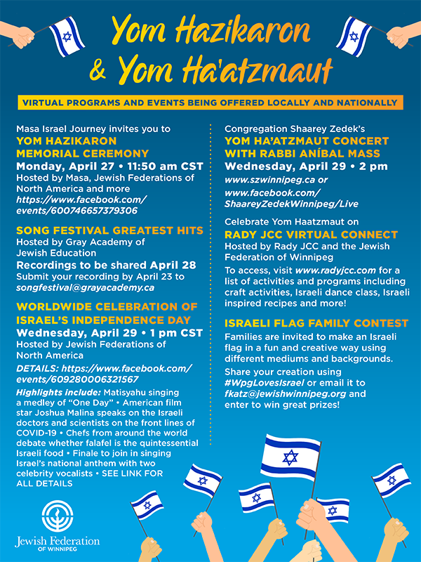 We invite you to be a part of virtual programs and events being offered locally and nationally for Yom Hazikaron, honouring Israel’s fallen soldiers, and Yom Ha’azmaut, where we will celebrate Israel’s 72nd birthday: