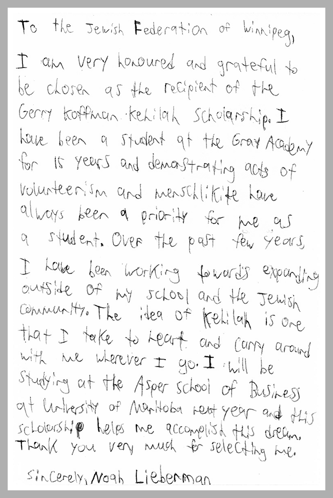 The Jewish Federation of Winnipeg is pleased to present Noah Lieberman with the Gerry Koffman Kehilla Award.
