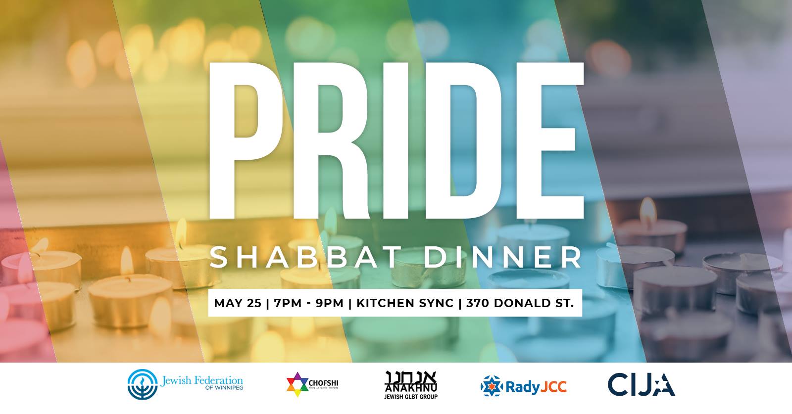 Join us May 25 for our first ever Pride Shabbat! This is our kickoff event for Winnipeg Pride! Register by May 23rd to ensure you have a seat at a table. Dietary laws will be observed. Seating is limited.