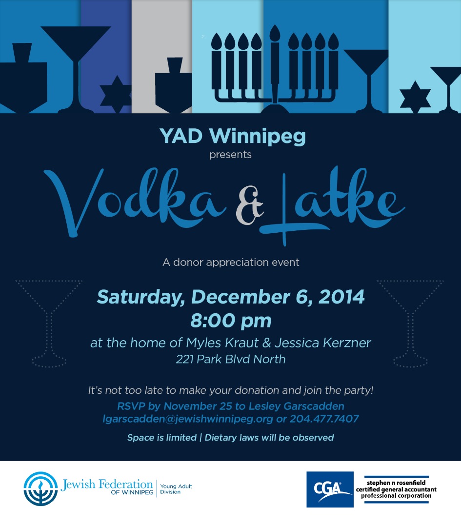 The Young Adult Division (YAD) has had tremendous success this year with their efforts towards the Combined Jewish Appeal's (CJA) Campaign. Since September, YAD has added 47 new donors to the campaign, and continues to grow. In celebrating success, YAD Winnipeg presents Vodka & Latke, a donor appreciation event.