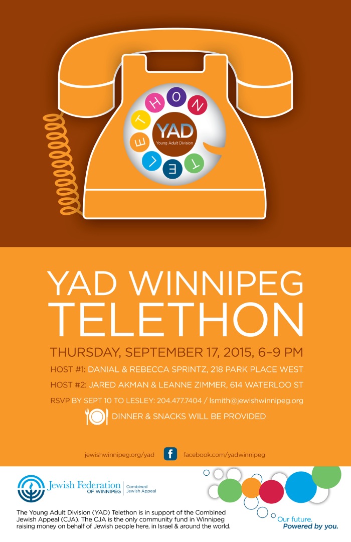The Young Adult Division (YAD) Telethon in support of the Combined Jewish Appeal (CJA). The CJA is the only community fund in Winnipeg raising money on behalf of Jewish people here, in Israel and around the world.
