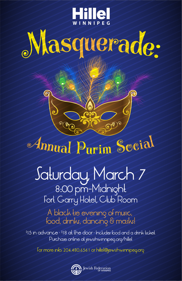 Join Hillel Winnipeg on March 7, 2015 for a black tie event! Masquerade: Annual Purim Social at the Fort Garry Hotel - a night of music, food, dancing and masks! 18+. Click here to purchase tickets online now