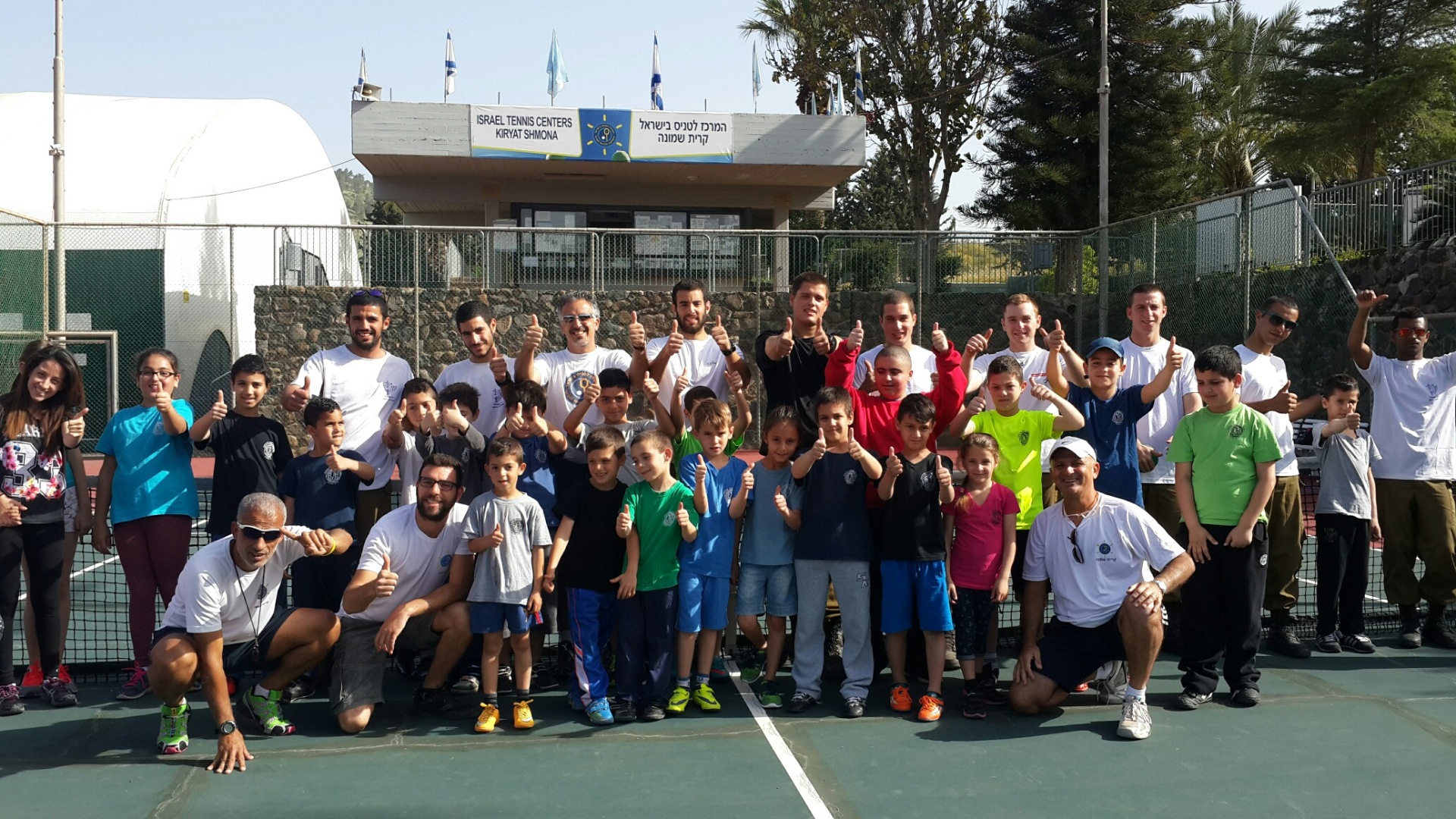 Given the tension around the security situation with the Israeli-Syrian border some of the participants of the Embrace program were quite stressed and worried about their wellbeing. To this end, Shaul the director of the Tennis Centre, invited a group of IDF combat soldiers that are involved in patrolling the borders to come and speak with the kids and explain to them the work they do in keeping the borders safe. After some Q&A kids and soldiers did some team building activities together which kept everyone happy and active.