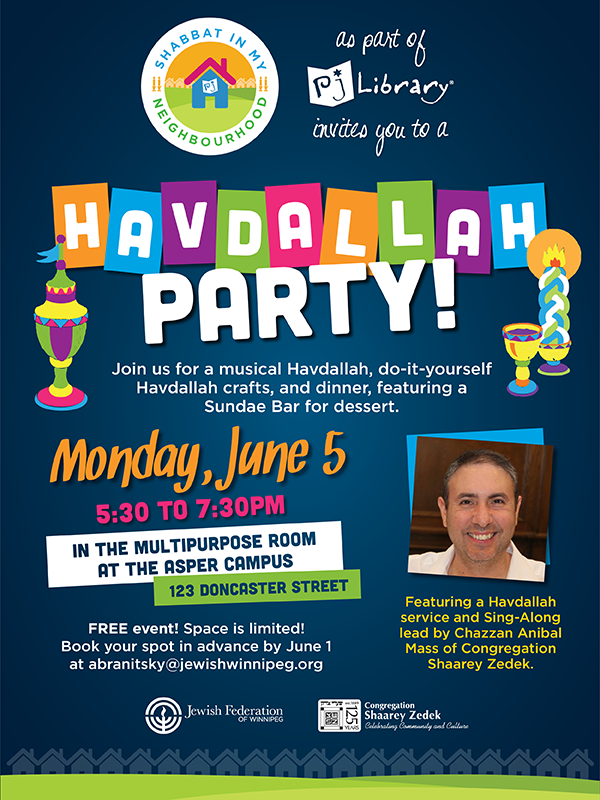 Shabbat in my Neighbourhood, as a part of PJ Library, invites you to a Havdallah Party! Join us for a musical Havdallah, DIY Havdallah crafts, and dinner - featuring a sundae bar for dessert!