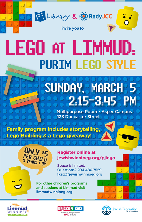 Join PJ Library and Rady JCC for Lego at Limmud! Purim Style Lego as part of Limmud Winnipeg. Register online now