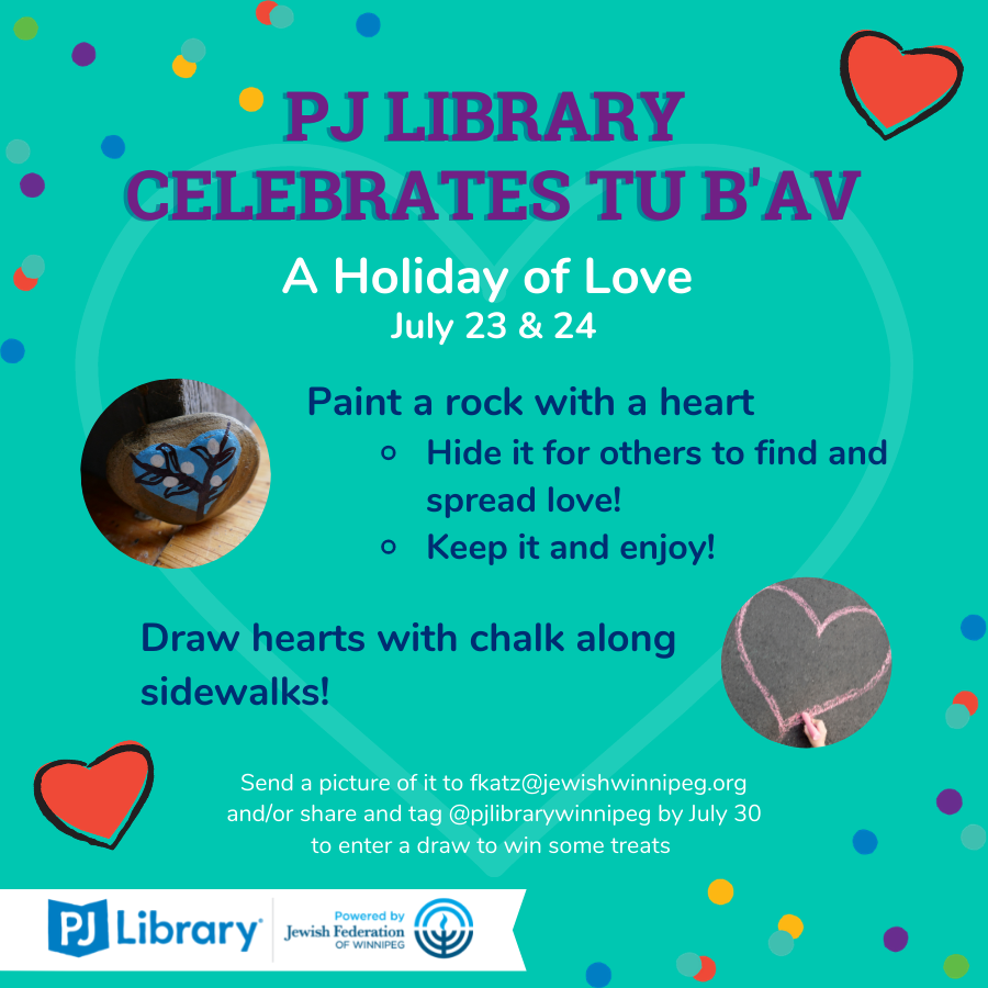 Celebrate Tu B'av, a holiday of love with PJ Library on July 23 & 24. Paint a rock with a heart, draw hearts with chalk along the sidewalk. Please send all pictures to fkatz@jewishwinnipeg.org and/or tag @pjlibrarywinnipeg by July 30 to enter in a draw to win some treats!