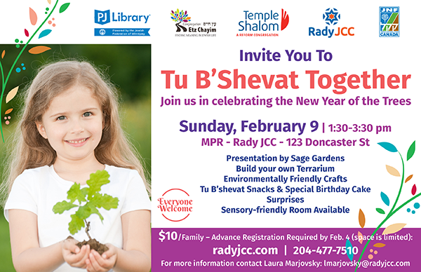 Join us in celebrating the New Year of the Trees! Presentation by Sage Gardens, build your own terrarium, environmentally friendly crafts, Tu B'Shevat snacks, special birthday cake, and surprises! Sensory-friendly room available. $10/family, advanced registration required.
