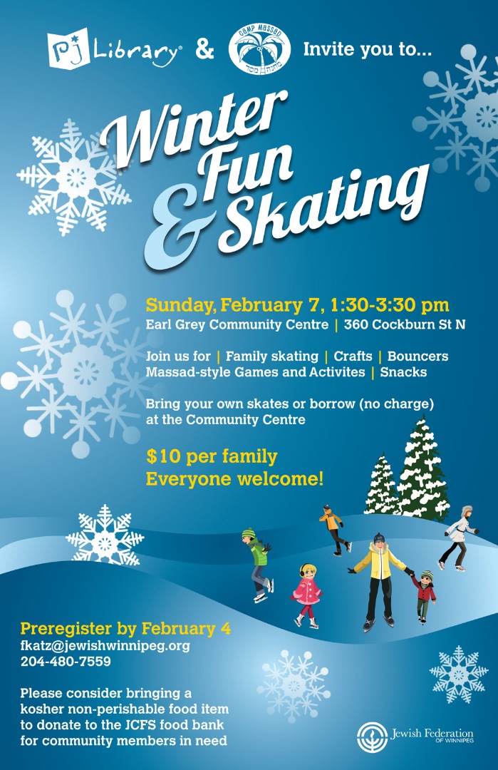 PJ Library and Camp Massad invited you to Winter Fun and Skating on Sunday, February 7, 1:30-3:30 pm at Earl Grey Community Centre - 360 Cockburn St N.